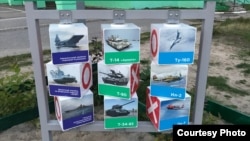 Карусели на площадке сделаны в виде танков, других боевых машин и самолетов-истребителей. На некоторых из них написано "ЗА Родину". На площадке есть "крестики-нолики" с картинками боевых кораблей, щит с фотографиями детей в военной форме и конструкция, на которой написано "Я люблю Юнармию".