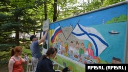 Они сообщили, что на доске почета раньше висели фотографии отличившихся печерян, но потом доска стала пустовать. В 2015 году ее с разрешения властей расписали участники местного православного клуба "Феникс" при Псково-Печерском монастыре. Им помогала художница Ирина Гурская. На рисунке были изображены веселые люди за столом. По обеим сторонам от него стояли флаги: российский и андреевский. 28 апреля 2022 года неизвестные перекрасили российский флаг и превратили его в антивоенный.